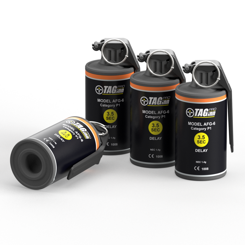 The TAGinn AFG-6 is a field-grade pyrotechnichand simulation grenade. It filled with dried peas, and made of foamed polyurethane and cardboard body.
